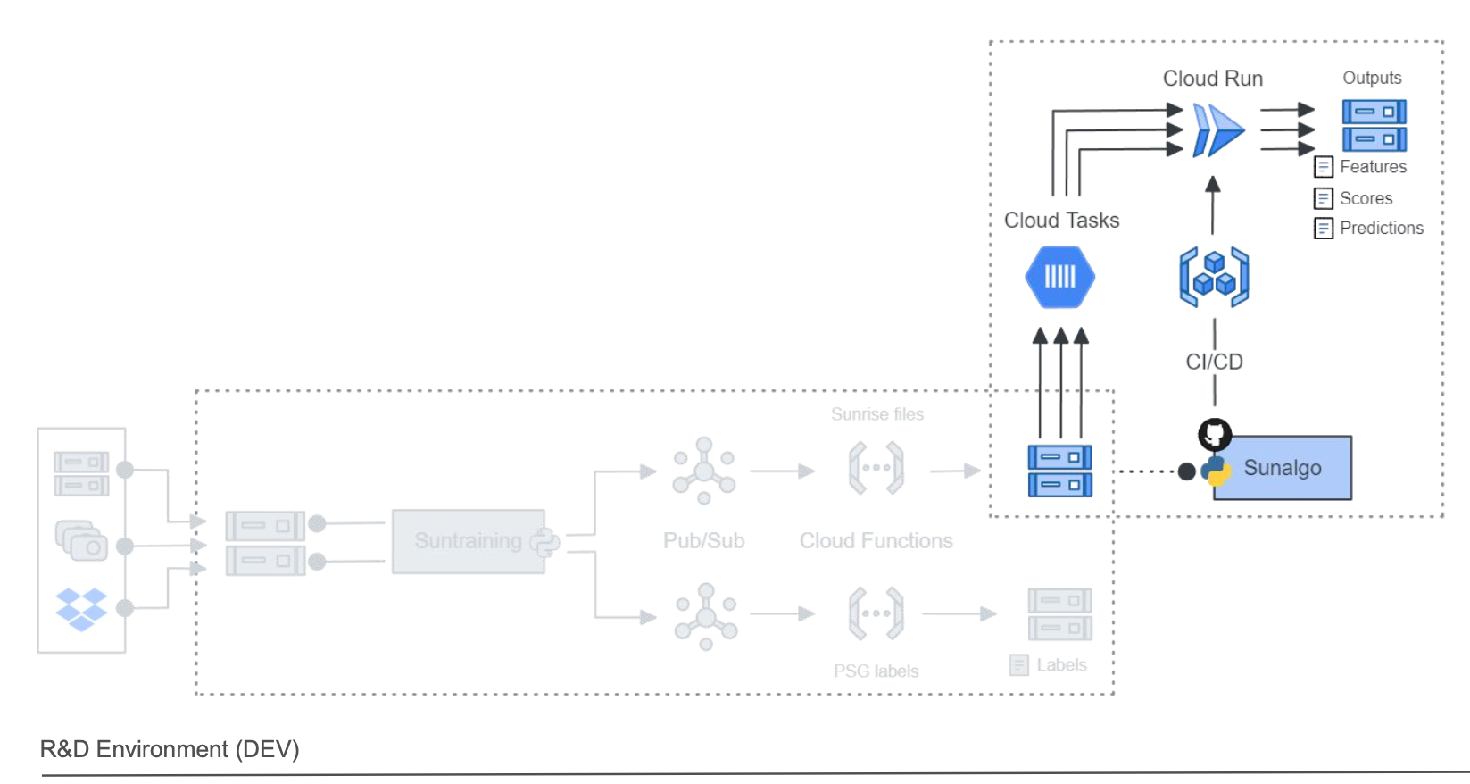 Our sunalgo code was packaged as a docker container and stored in our artifact repository on Google Cloud. The container could then be used and deployed on Cloud Run instances. Cloud Run is a serveless service that can scale up and parallelize processing (up to 1000 instances), and scales down (even to zero) when no instance is needed. Our dockerfile looks like this: